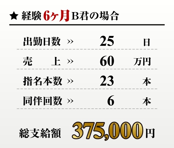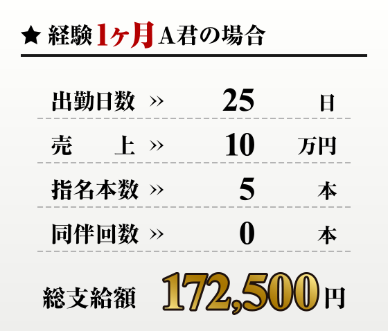最低保障日給6000円~いくらでも(昇給制度有) 日給の他に、売上バック・指名バック・同伴バック・ヘルプバック・売上ナンバー賞・指名組数賞・皆勤賞等、多数賞与あり |